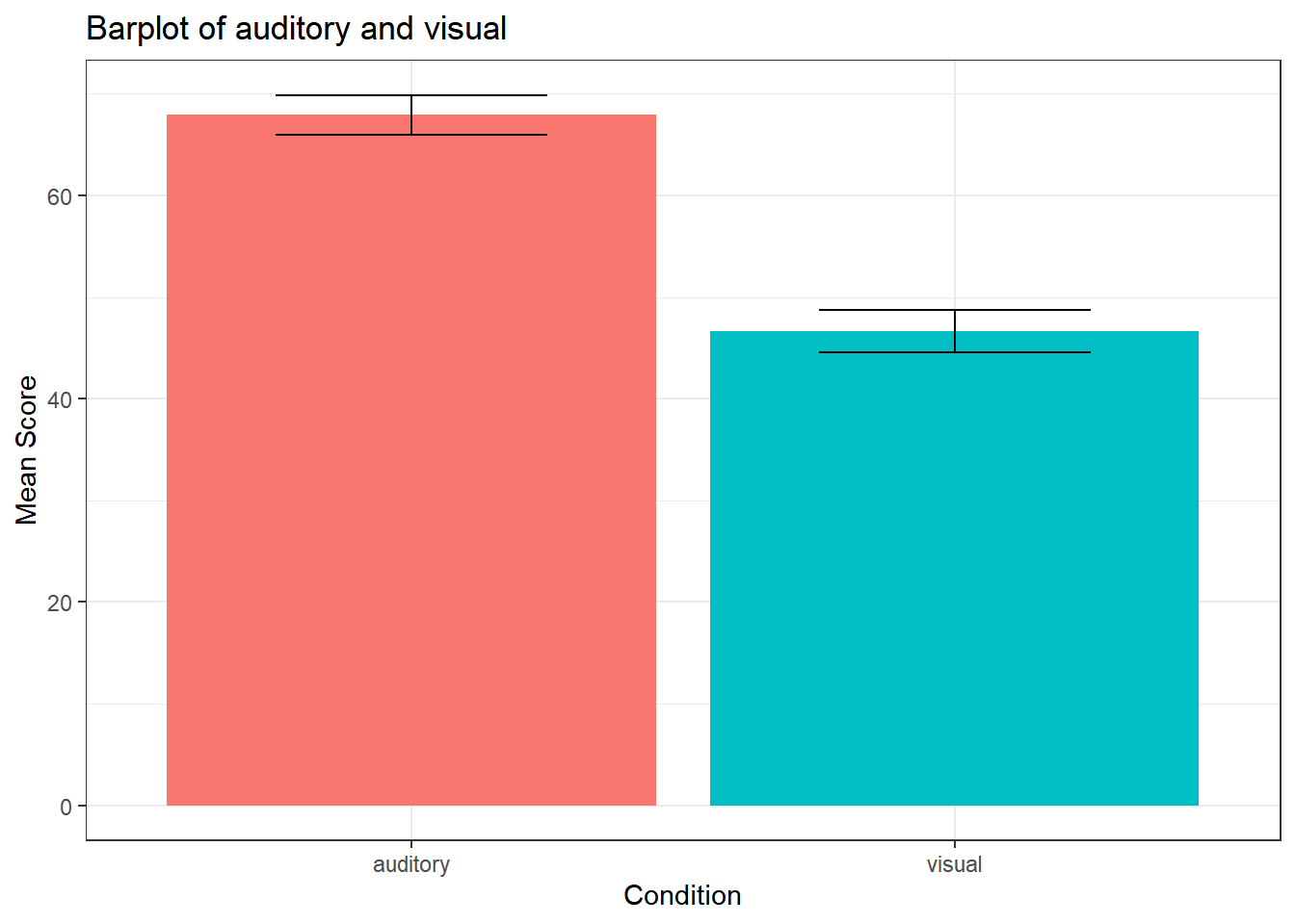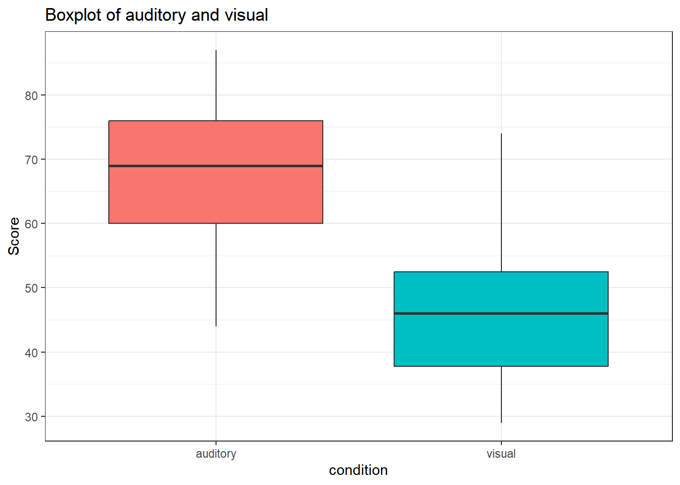tetris |>ggplot(aes(condition, score, fill = condition)) +geom_boxplot() +guides(fill ="none") +ggtitle("Boxplot of auditory and visual") +ylab("Score") +theme_bw()