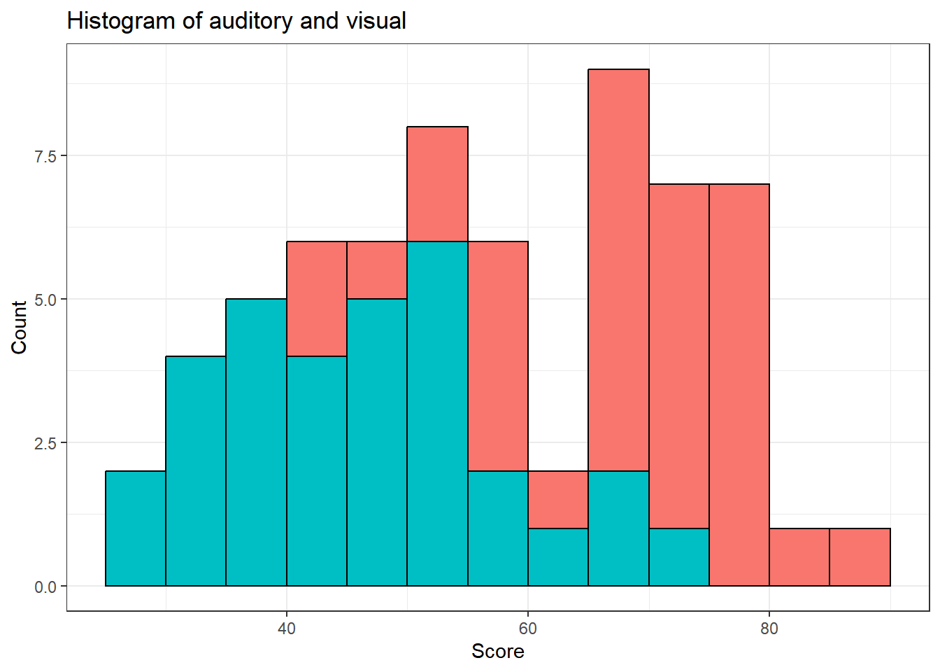 tetris |>ggplot(aes(score, fill = condition)) +geom_histogram(aes(, after_stat(count)),binwidth =5, center =2.5,color="black") +guides(fill ="none") +ggtitle("Histogram of auditory and visual") +xlab("Score") +ylab("Count") +theme_bw()